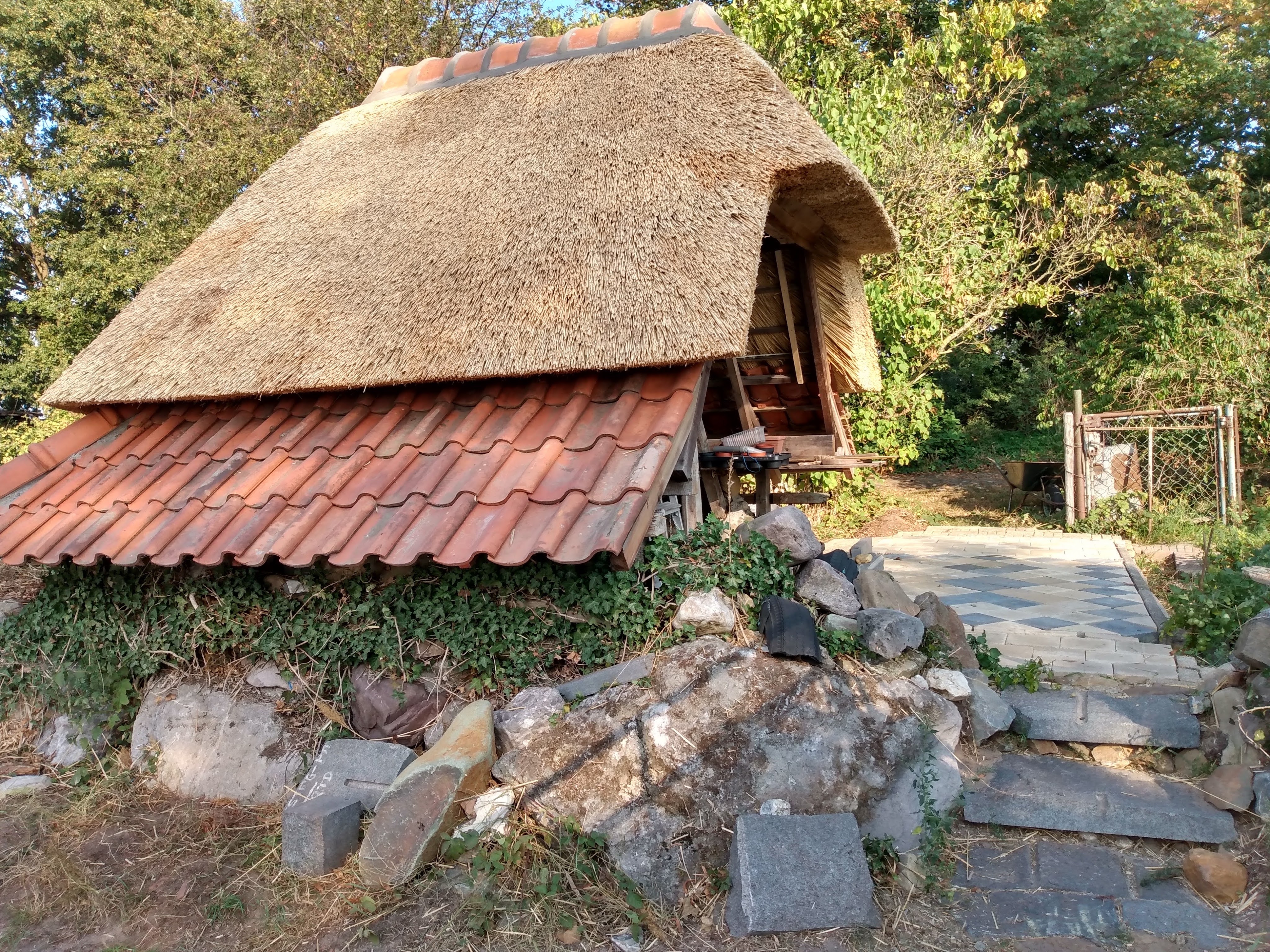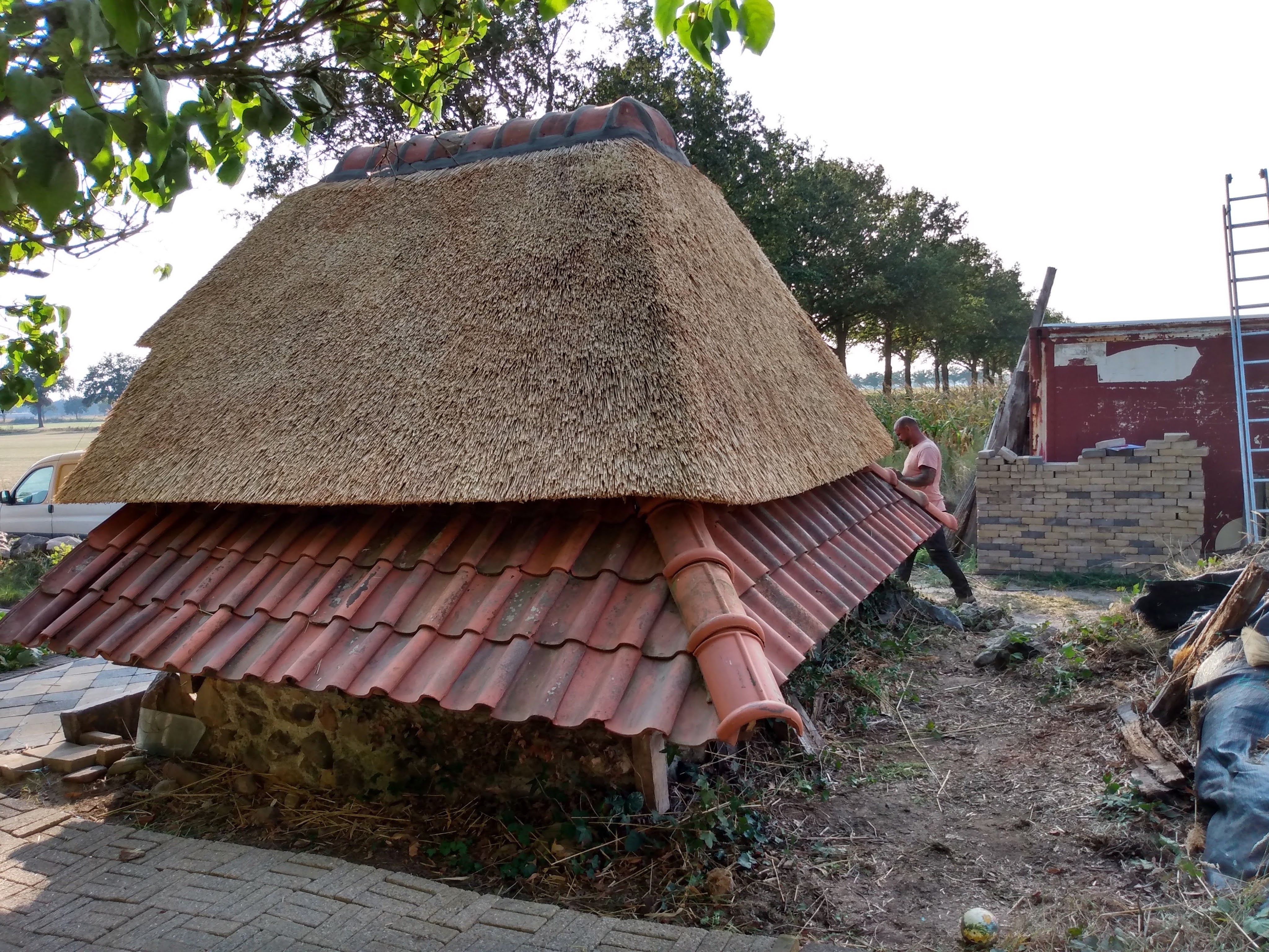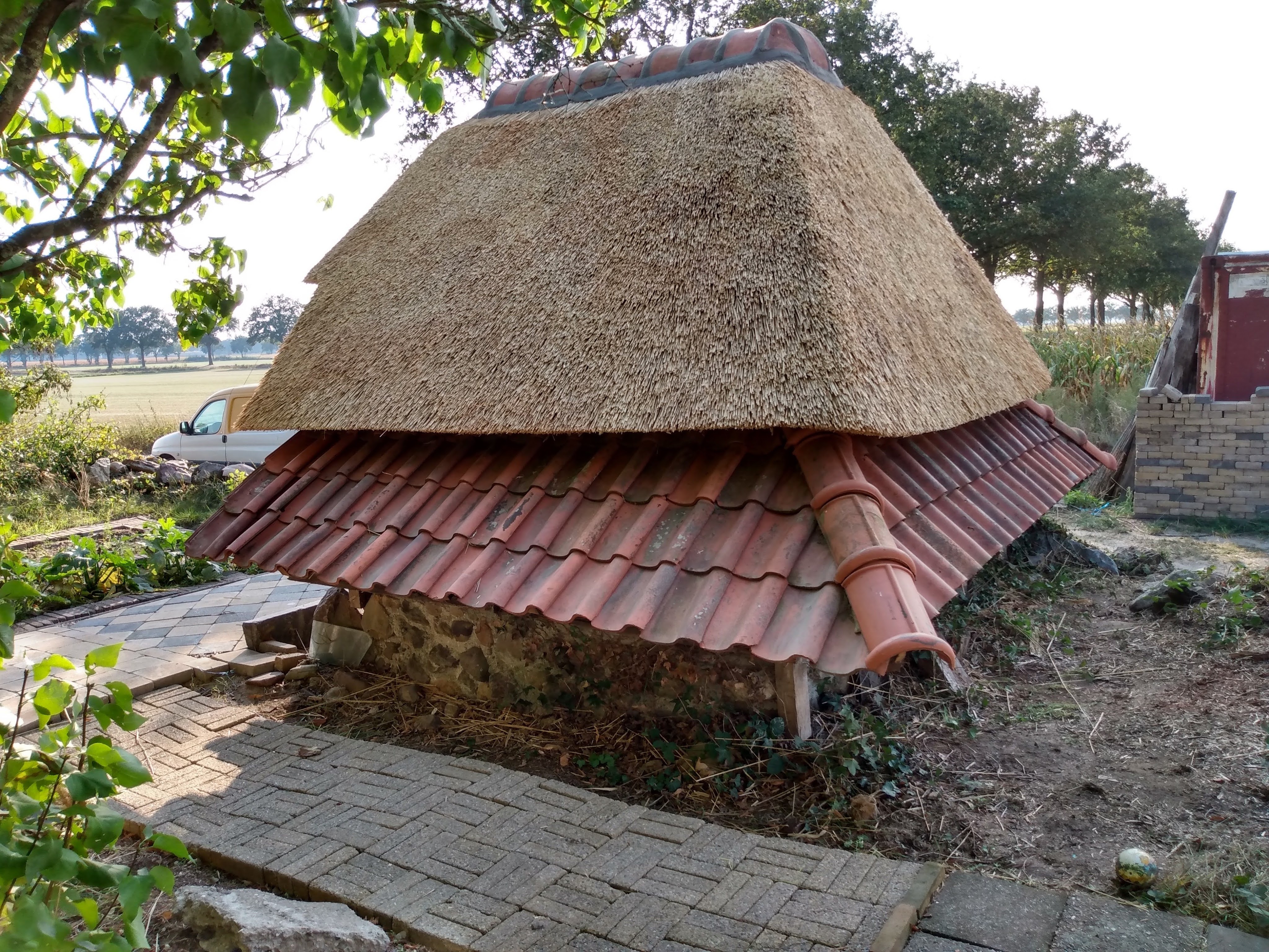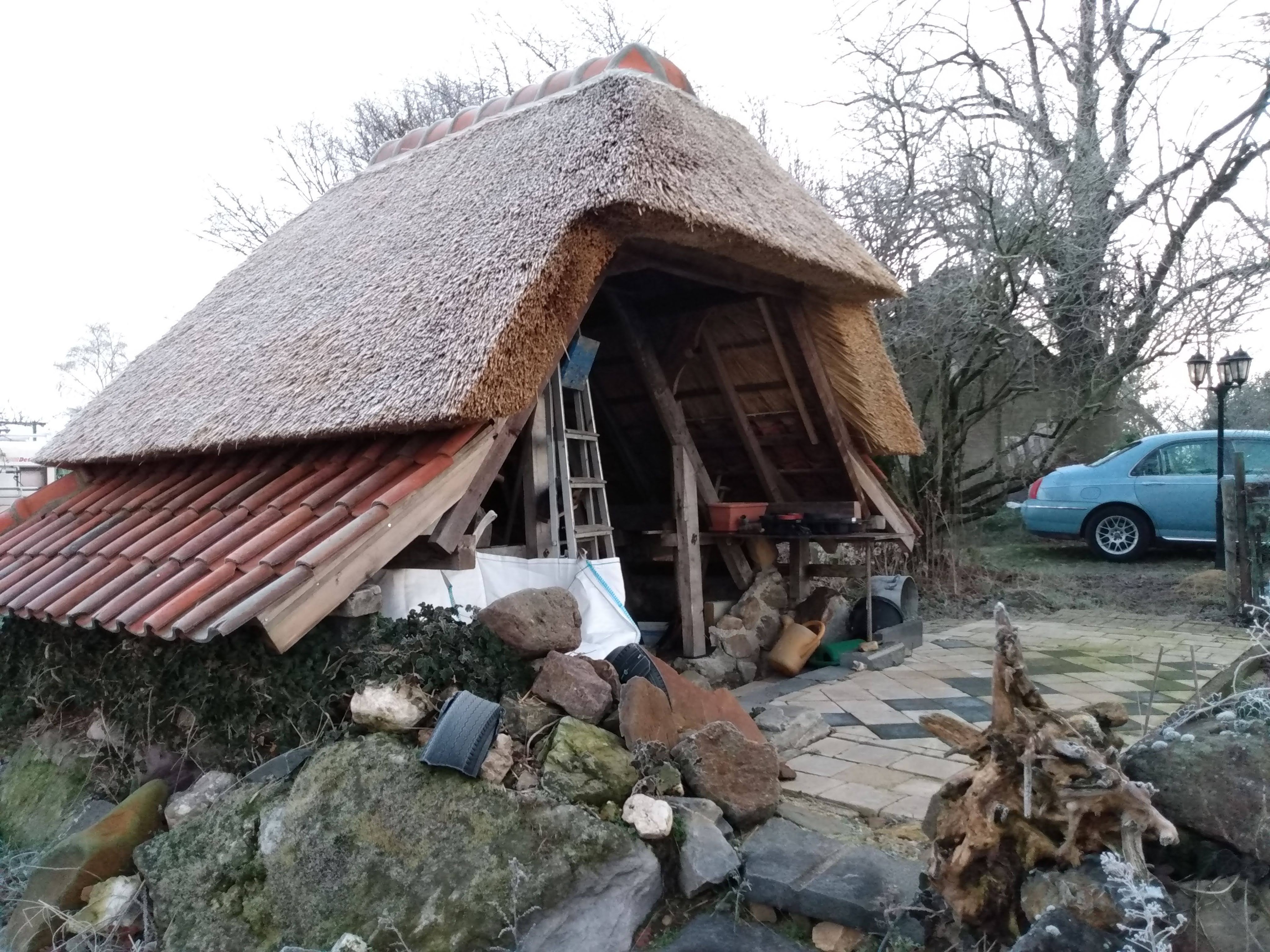 Thatching such a small roof is a very timeconsuming business, besides that, it takes much more reed, compared with a larger roof, because of the short reed, that is needed for the top.