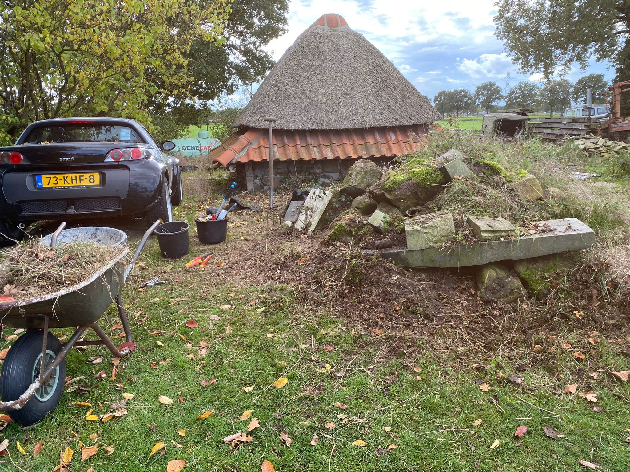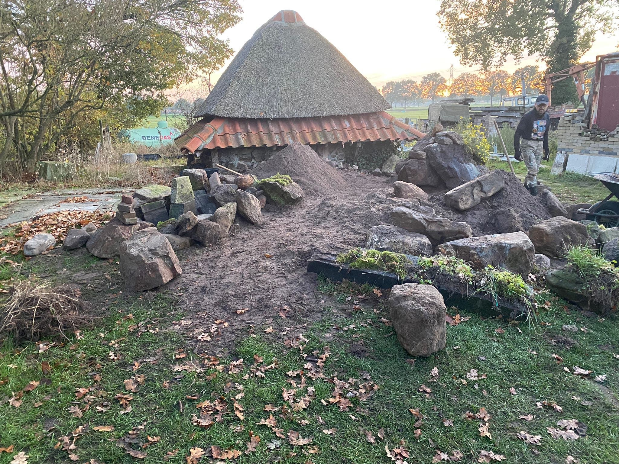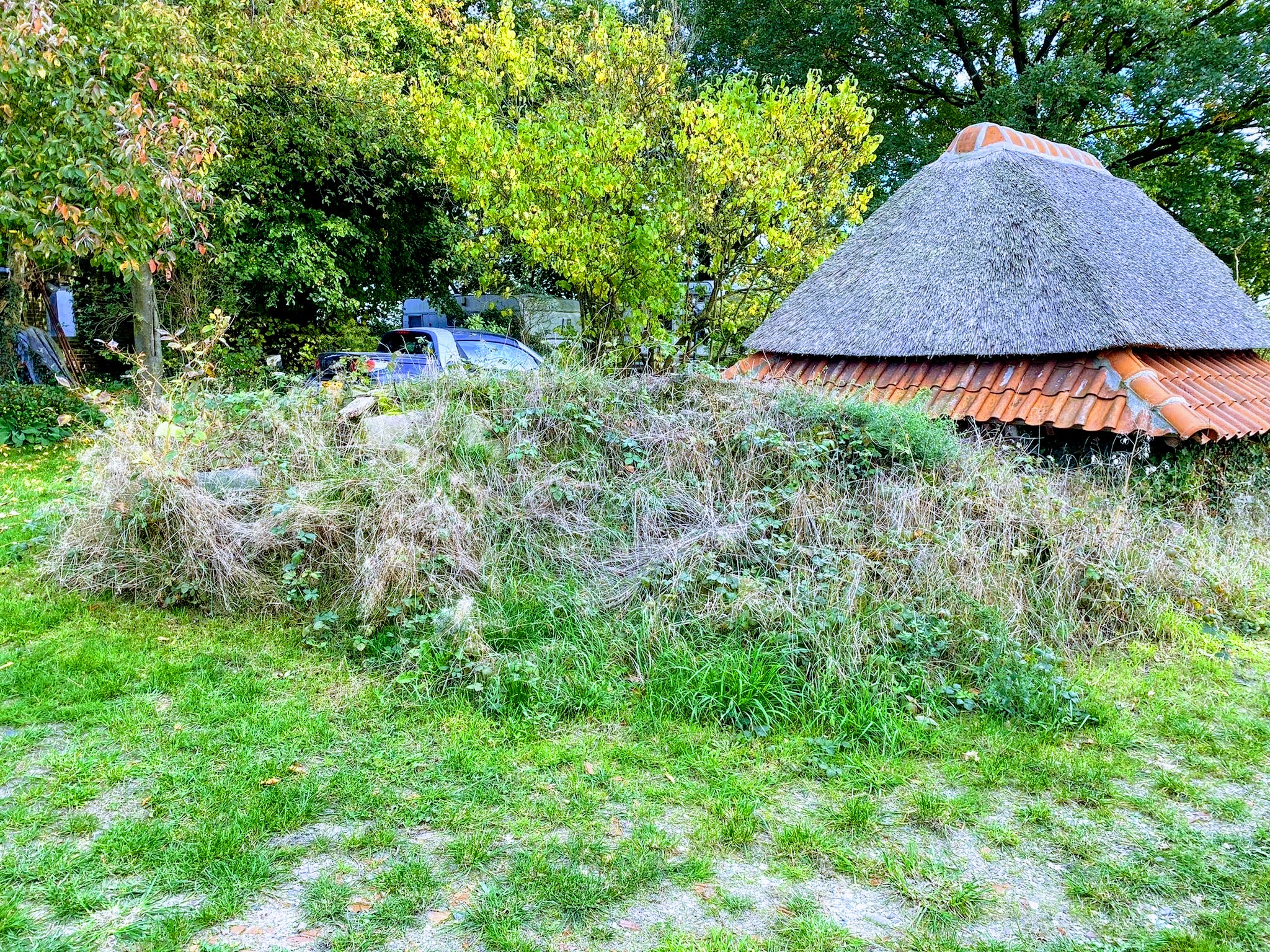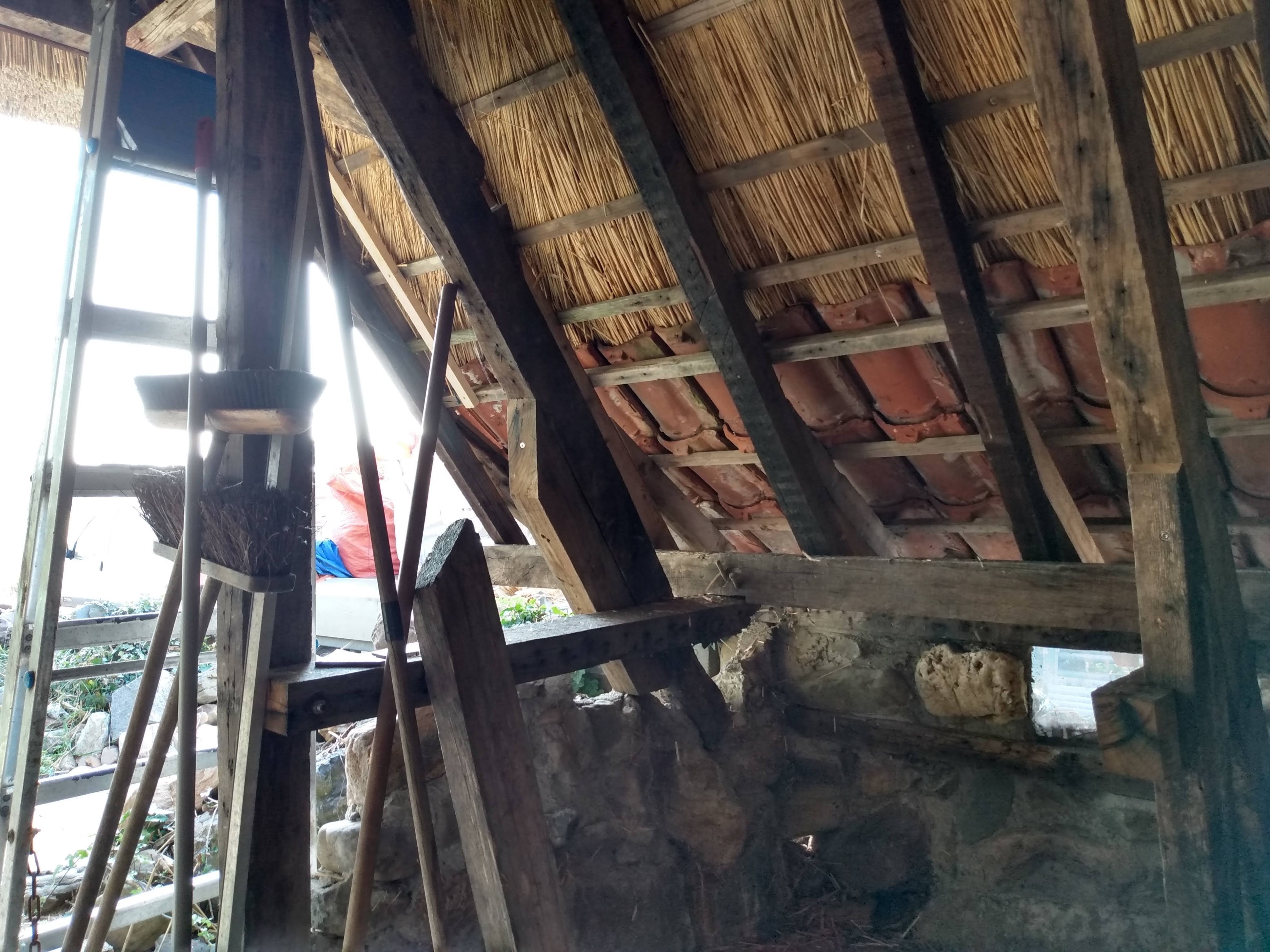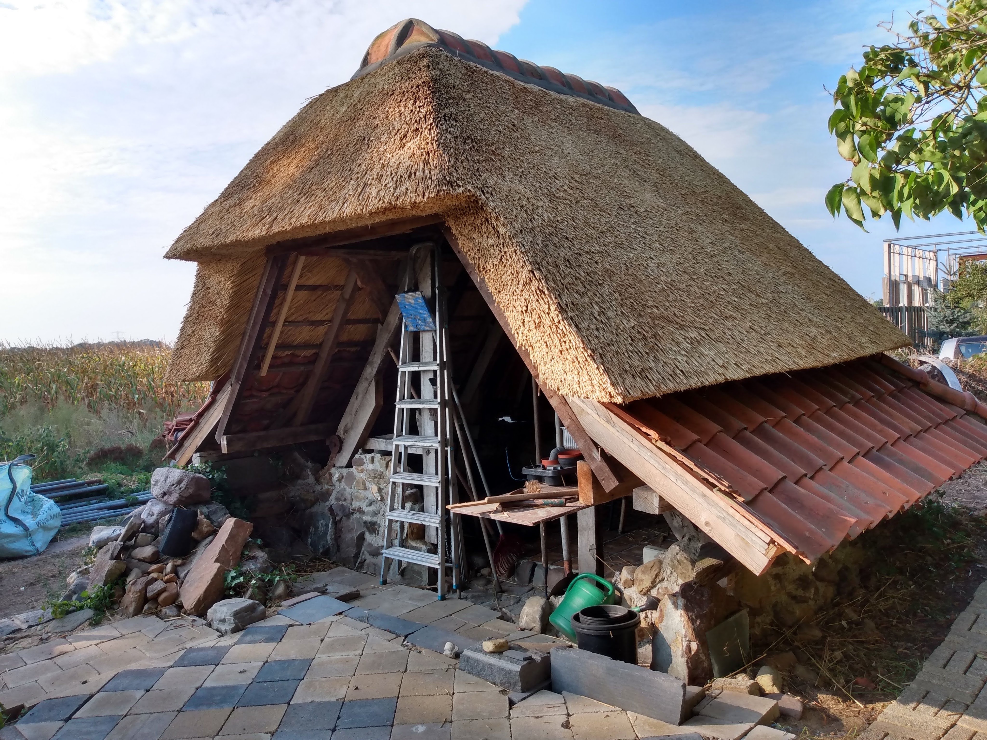 Thatching such a small roof is a very timeconsuming business, besides that, it takes much more reed, compared with a larger roof, because of the short reed, that is needed for the top.